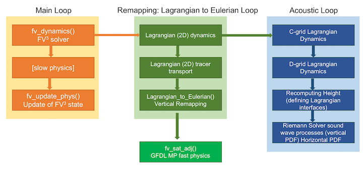 There are two levels of time-stepping inside FV3. The first is the "remapping" loop, the green column in Figure 1. This loop has three steps: