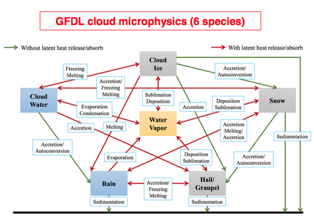 GFDL cloud microphysics (MP) scheme is a six-category MP scheme to replace Zhao-Carr MP scheme, and moves the GFS from a total cloud water variable to five predicted hydrometeors (cloud water, cloud ice, rain, snow and graupel). This scheme utilizes the "bulk water" microphysical parameterization technique in Lin et al. (1983) [120] and has been significantly improved over years at GFDL (Lord et al. (1984) [127], Krueger et al. (1995) [114], Chen and Lin (2011) [31], Chen and Lin (2013) [32]). Physics processes of GFDL cloud MP are described in Figure 1 (also see warm_rain() and icloud()) and are feature with time-split between warm-rain (faster) and ice-phase (slower) processes (see 'conversion time scale' in gfdl_cloud_microphys.F90 for default values).