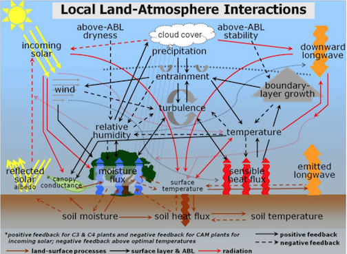 Land-atmosphere interactions are a main driver of Earth's surface water and energy budgets. The importance of the land surface is rather intuitive, and has been demonstrated not only in terms of predictability on daily to seasonal timescale (Betts et al. (2017) [24]), but also in terms of influencing extremes such as drought and heatwaves (Paimazumder and Done (2016) [159]), PBL evolution and cloud formation (Milovac et al. (2016) [141]) and afternoon convection (Guillod et al. (2015) [75]), and tropical cyclone re-intensification (Andersen and Shepherd (2014) [5]). Other linkages, such as the role of soil moisture (SM) or vegetation heterogeneity in mesoscale circulation (Hsu et al. (2017) [98]) and planetary waves (Koster et al. (2014) [111]), and those driven by land use and land cover change or management (Hirsch et al. (2015) [92]; Findell et al. (2017) [59]) are topics of active research.