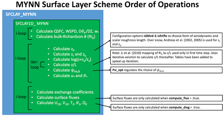 Within the MYNN surface layer scheme, there is a dependency check for the first timestep. If true, several arrays are initialized at every i point. This is done because (1) some variables are calculated in schemes called after the surface layer call and (2) some variables are used within iterative processes and may not be specified until later in the surface layer scheme. The main order of operations and hightlight relevant subroutines in sfclay1d_mynn().