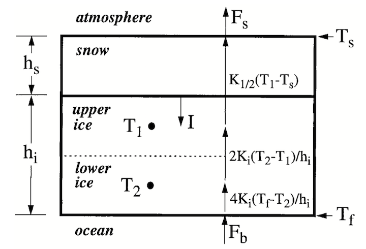 The model has four prognostic variables: the snow layer thickness \(h_s\), the ice layer thickness \(h_i\), the upper and lower ice layer temperatures located at the midpoints of the layers \(h_i/4\) and \(3h_i/4\) below the ice surface, respectively \(T_1\) and \(T_2\). The temperature of the bottom of the ice is fixed at \(T_f\), the freezing temperature of seawater. The temperature of the top of the ice or snow, \(T_s\), is determined from the surface energy balance. The model consists of a zero-heat-capacity snow layer overlying two equally thick sea ice layers (Figure 1). The upper ice layer has a variable heat capacity to represent brine pockets.